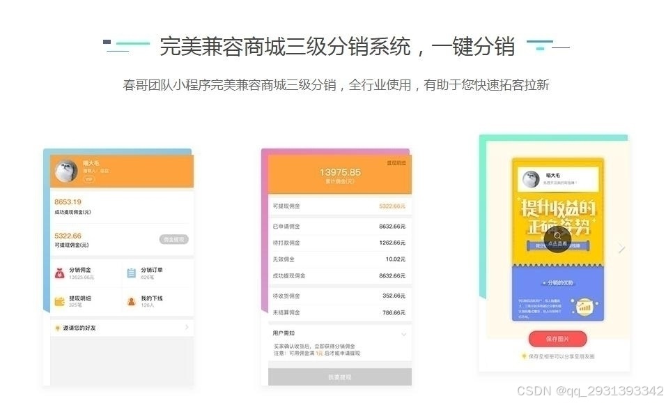 这款分销商城系统基于微信生态开发,同时支持小程序和公众号两端,主要包含以下核心功能模块:
