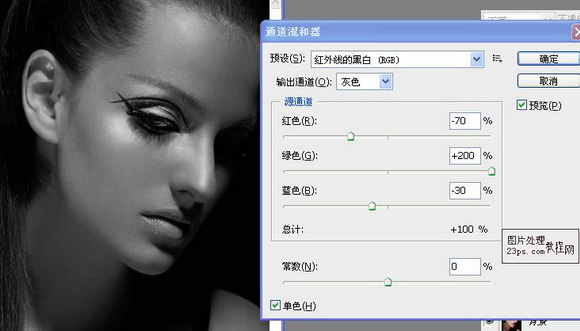3、新建通道混合器调节层,预设改为红外线的黑白,并调整参数,具体如下。