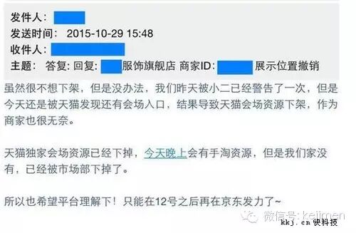 对此,京东说:阿里的实际行为恰恰是在限制消费者选择,不让商家自由选择其他平台搞促销,何谈让消费者选择。在京东给媒体提供的邮件截图中显示,被隐去姓名的商家称“被小二已经警告过了一次,但是今天还是被天猫发现还有会场入口,结果导致天猫会场资源下架。” 11月3日下午,京东再次收到商家表示收到某平台“二选一”的要求,将放弃参加京东“双十一”的任何活动。