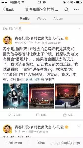 马云请了冯小刚导演,汪涵、刘谦等人领衔“双11”晚会也是醉了,借助阿里强大的舆论攻势,这条微博被专发六十多万次。这位按耐不住内心寂寞,自诩“乡村教师代言人”的全民干爹,终于也走上了娱乐的道路。